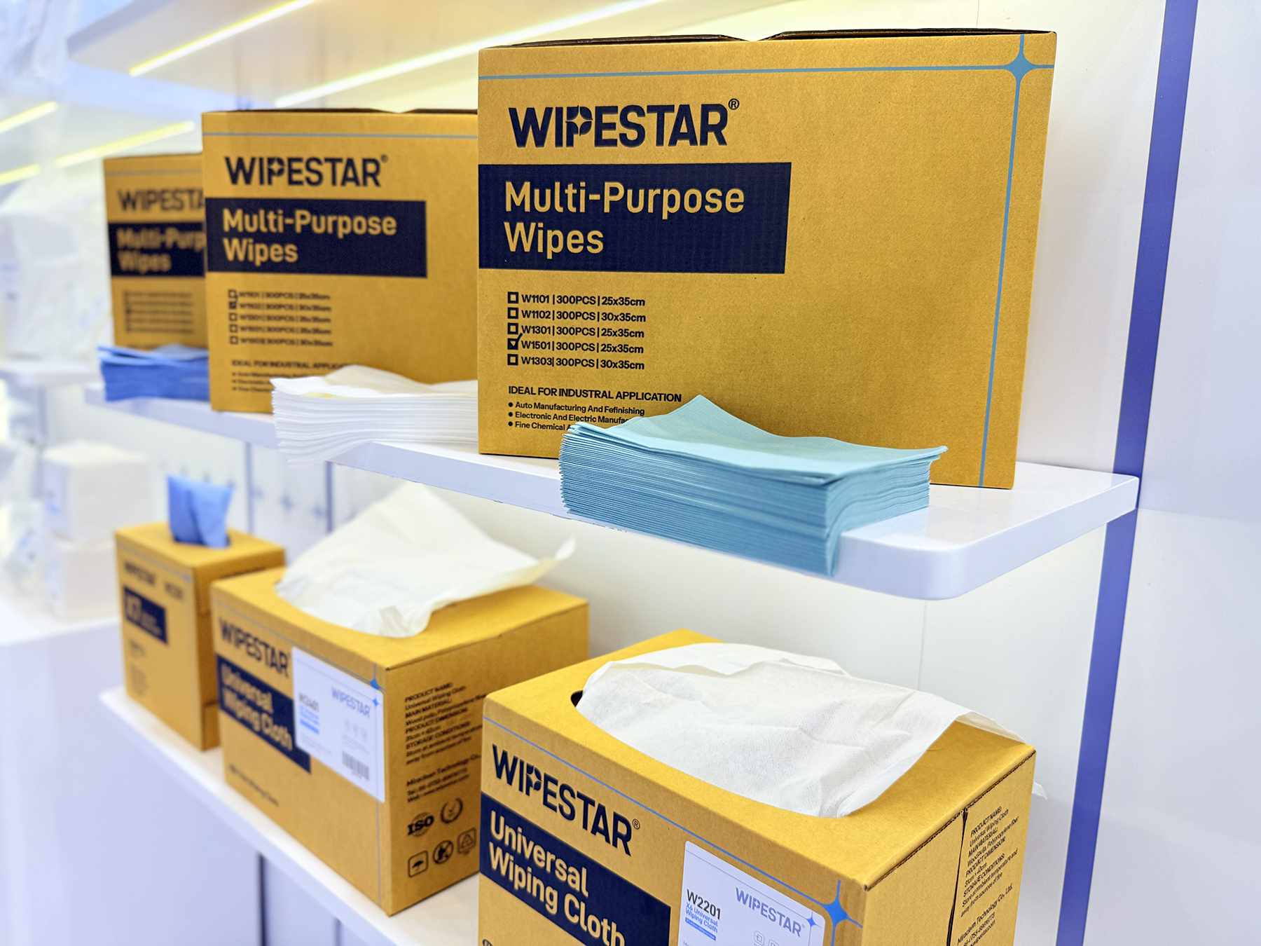其中,WIPESTAR的无尘擦拭系列,核心展品包括无尘布、无尘纸、无尘棉签、无尘湿巾等。为电子制造业提供了高品质的清洁产品,每一款产品都致力于减少微尘污染,提升生产效率,保障电子产品品质,是电子制造业不可或缺的伙伴。